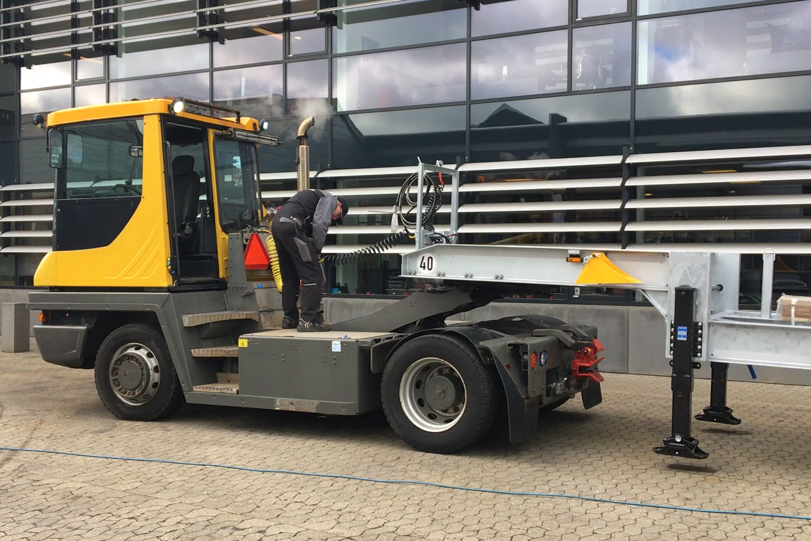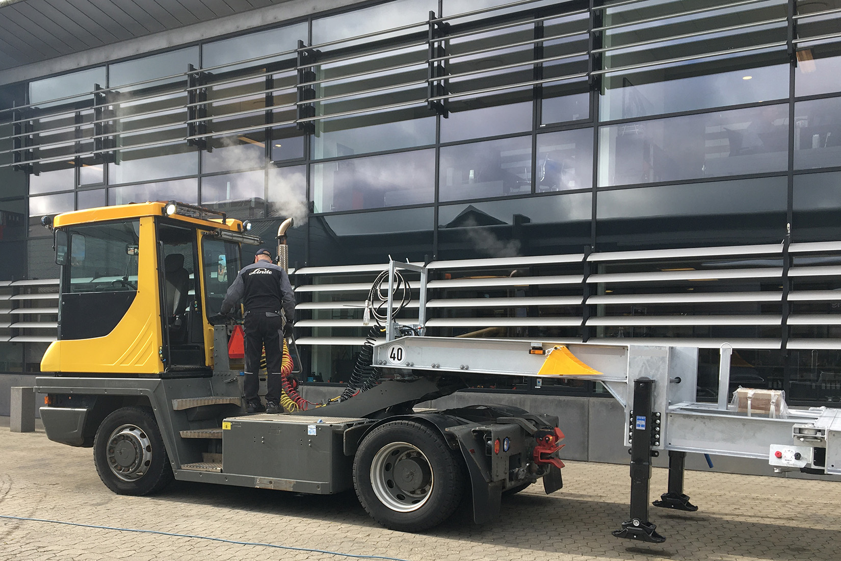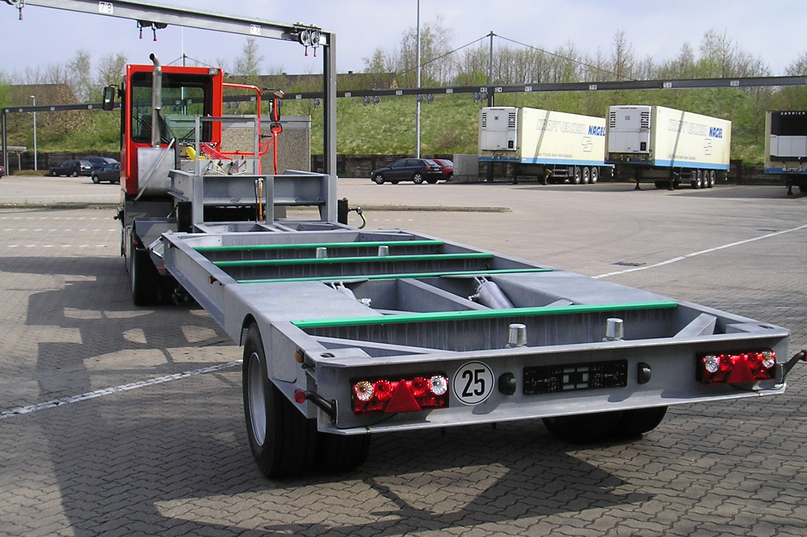 For å flytte vekselflak på terminaler. Kjører inn under et avsatt vekselflak fra en lastebil, og løfter hele traileren så den kan flyttes.
